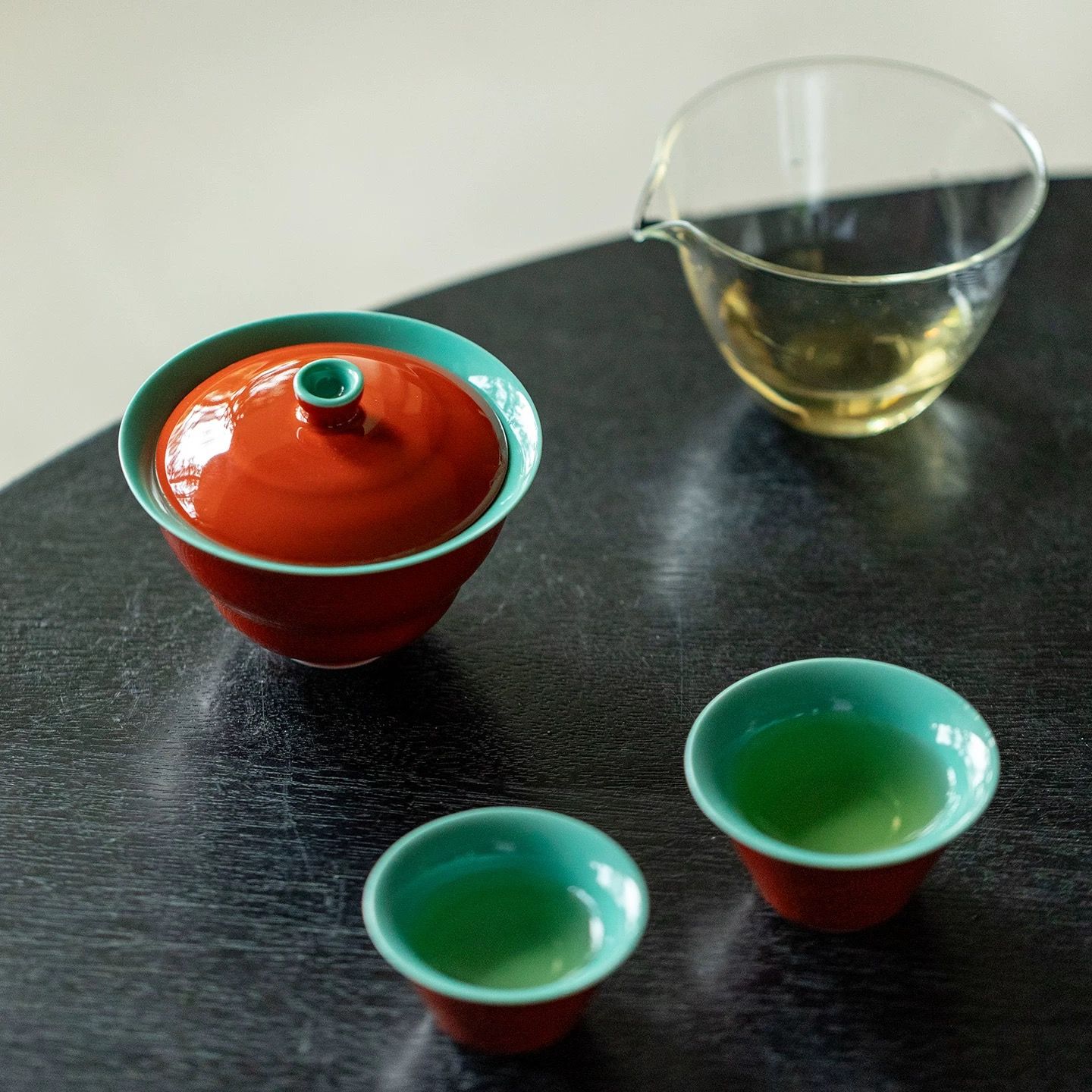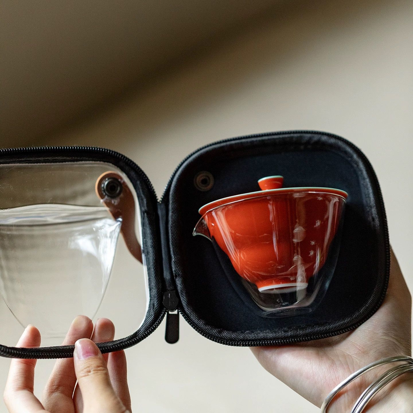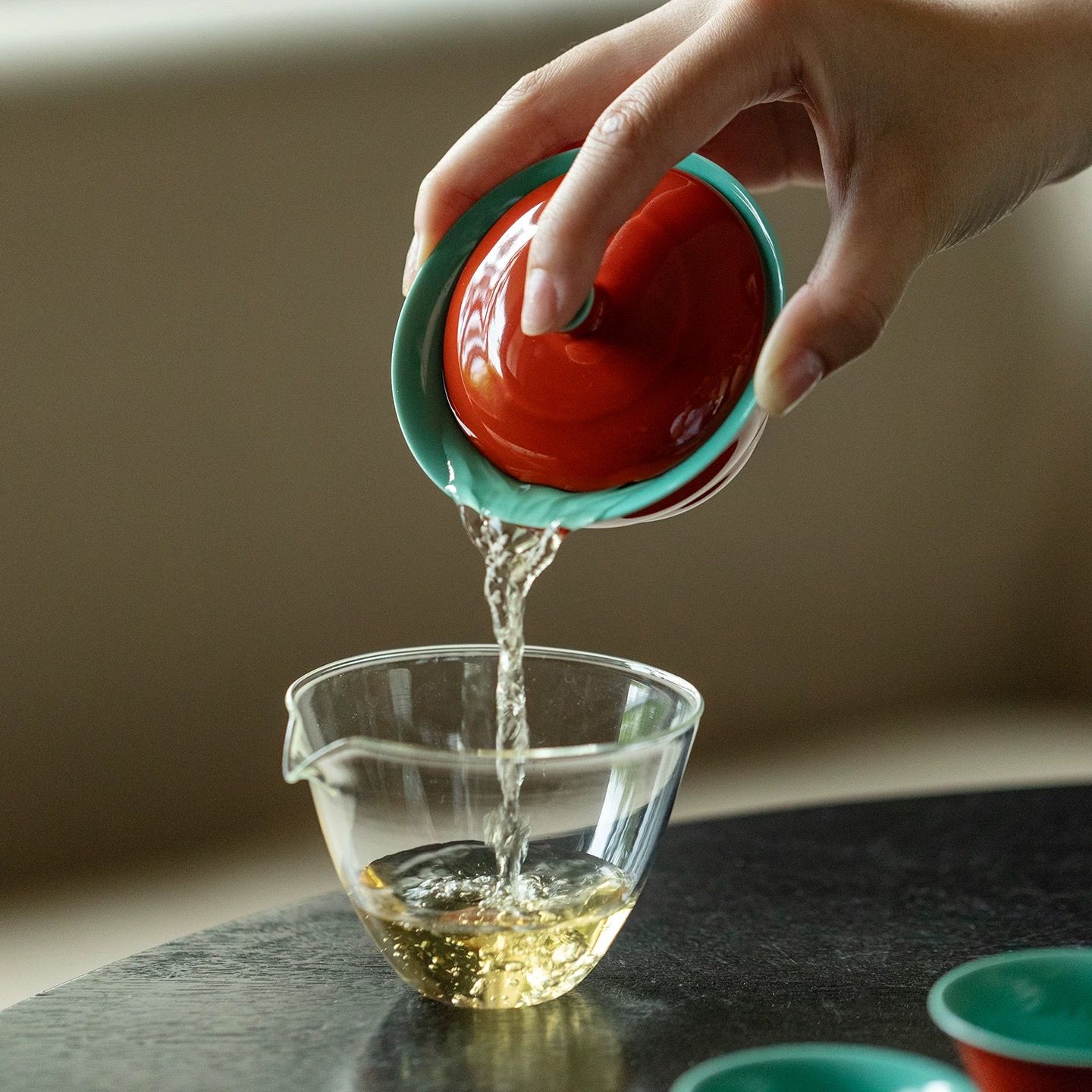 A refined tea ritual, designed to travel with you. Inspired by traditional Chinese aesthetics, this portable tea set combines vibrant glazed ceramic with clear glass, creating a quiet balance between warmth and clarity. Compact, elegant, and thoughtfully designed — it allows you to carry a complete tea experience wherever you go. ✨ The Experience A small set, yet a complete ritual. From brewing to pouring to tasting, each step flows naturally — simple, intentional, and deeply calming. Perfect for personal tea moments or sharing with one companion. 🍃 What’s Included • 1 Gaiwan (lidded tea bowl) • 1 Fairness Cup (glass pitcher) • 2 Teacups • 1 Protective Carrying Case A complete set for Gongfu-style tea, designed for both beginners and experienced tea drinkers. 🌊 Materials & Craft • Glazed ceramic (gaiwan & cups) • Heat-resistant glass (fairness cup) • Smooth color glaze finish • Origin: Dehua, China The contrast of textures — ceramic and glass — brings both visual clarity and tactile warmth to the tea experience. 📏 Dimensions Gaiwan (Lidded Bowl) • Diameter: 9.4 cm • Height: 7 cm • Capacity: 120 ml Fairness Cup (Glass Pitcher) • Length: 9.5 cm • Height: 6.5 cm • Capacity: 200 ml Small Teacup • Diameter: 5.8 cm • Height: 2.9 cm • Capacity: 40 ml Tea Cup • Diameter: 6.6 cm • Height: 3.5 cm • Capacity: 50 ml Carrying Case • Length: 12.5 cm • Width: 12 cm • Height: 13 cm 🌿 Designed for Everyday Use • Compact and easy to carry • Ideal for travel, office, or outdoor tea • Quick to set up, effortless to use Wherever you are, a quiet tea moment is always within reach. 💫 More than a tea set This is not just about making tea. It is about creating a small, portable space to slow down, to reconnect, and to return to yourself. Perfect for gifting, travel, or beginning your tea journey.