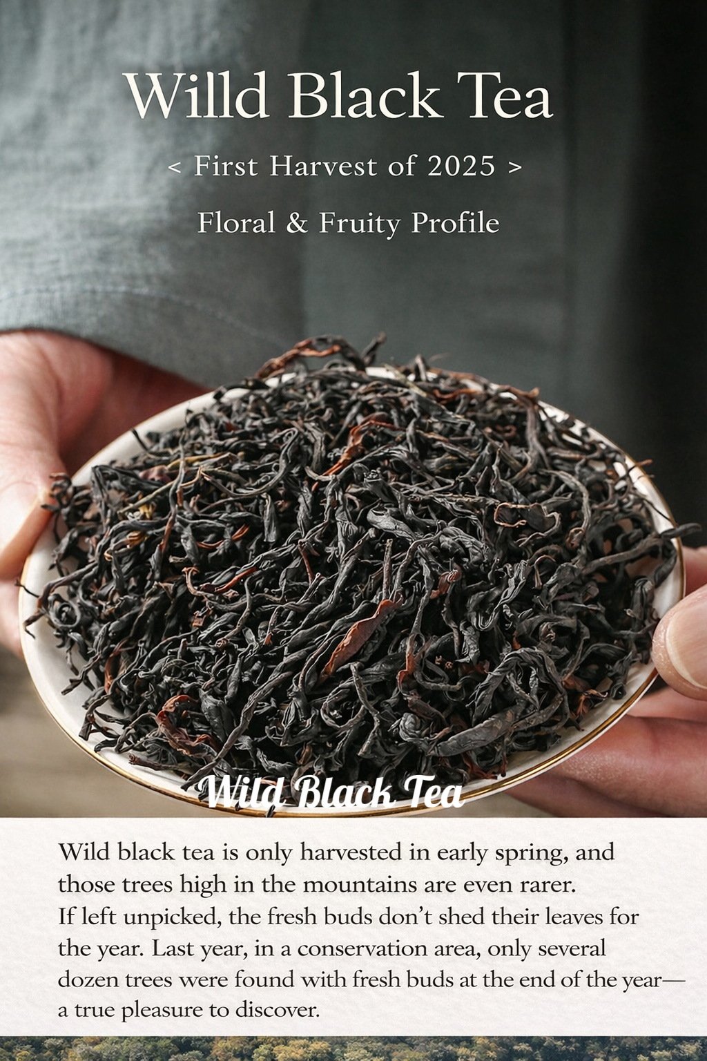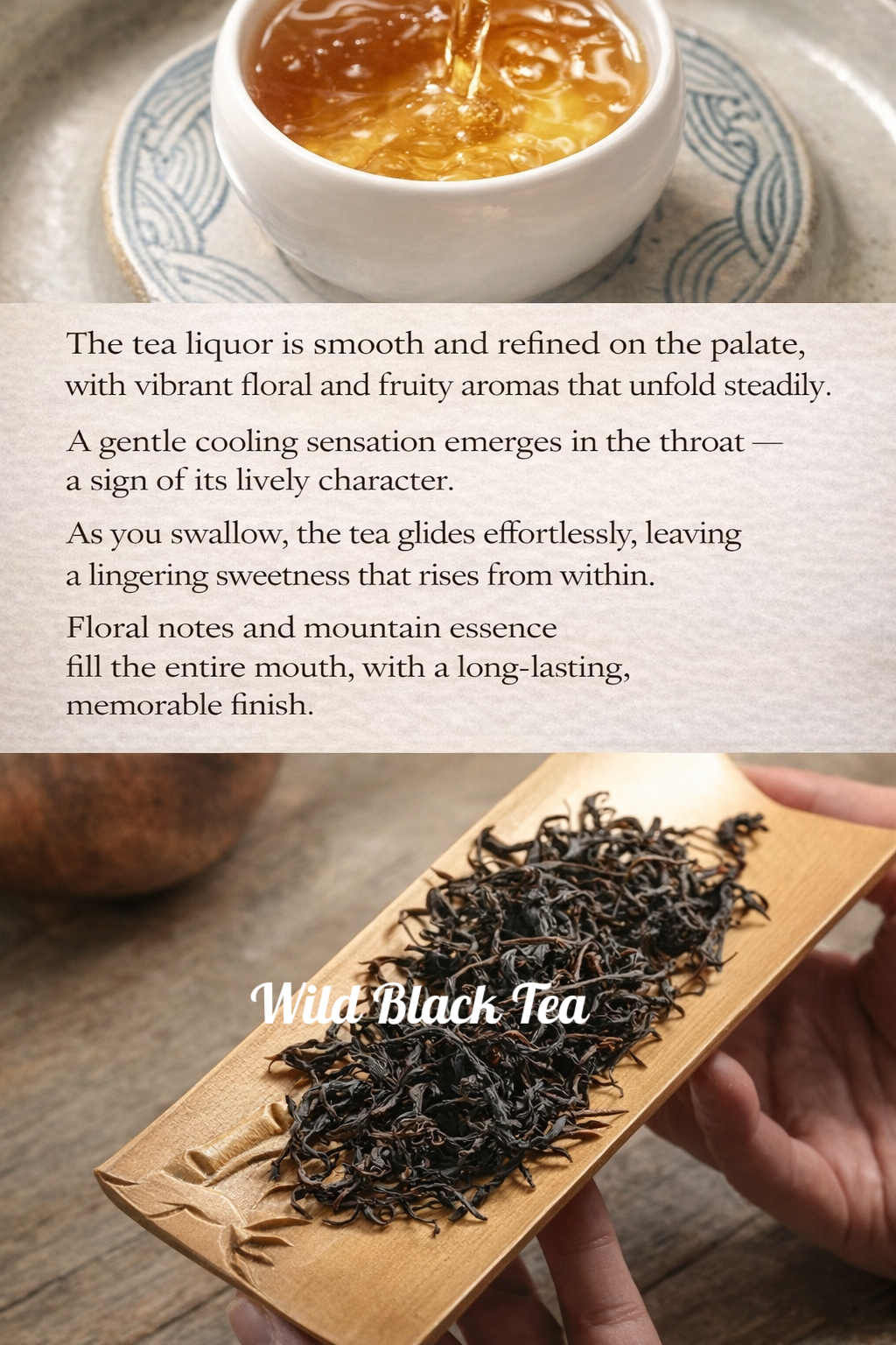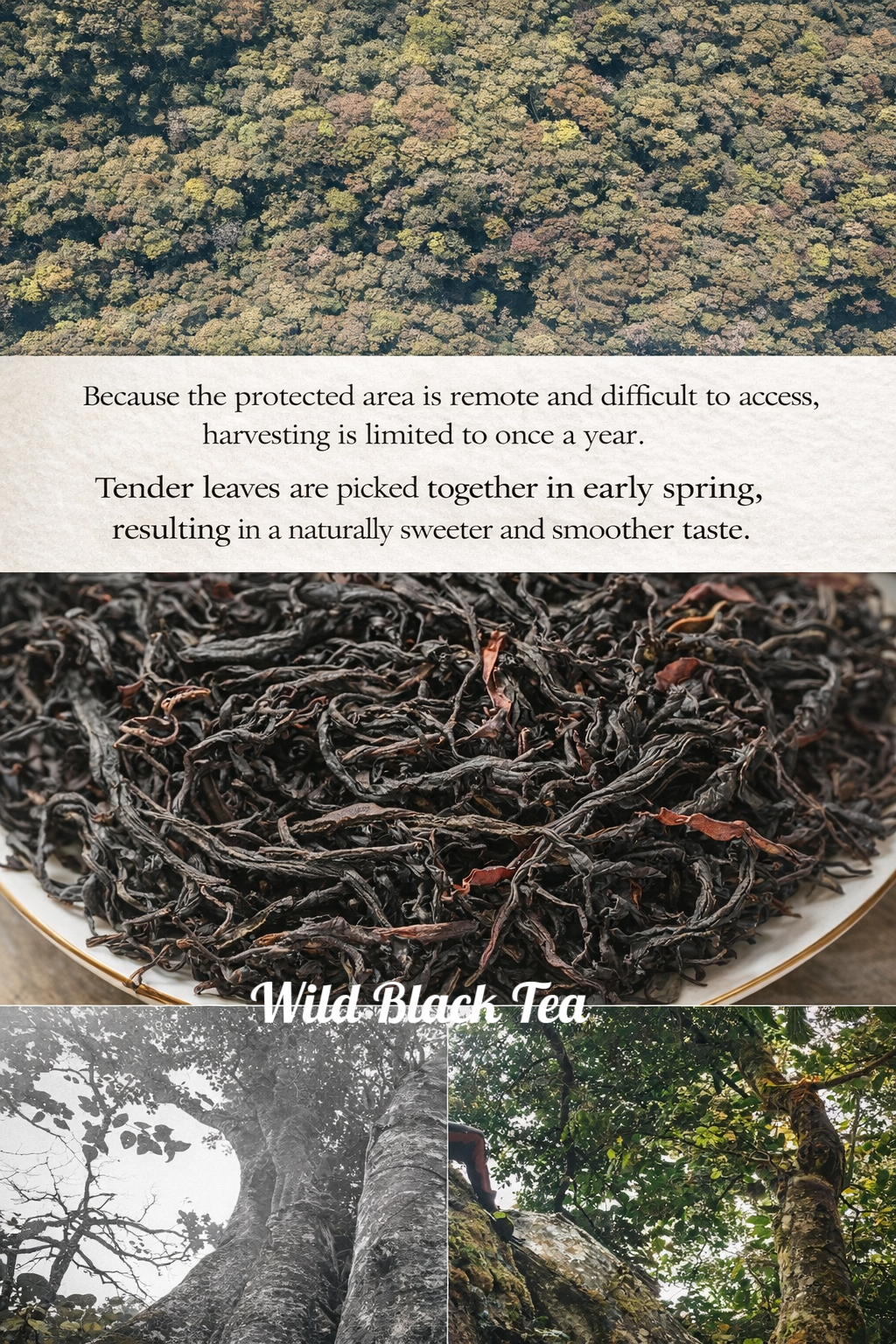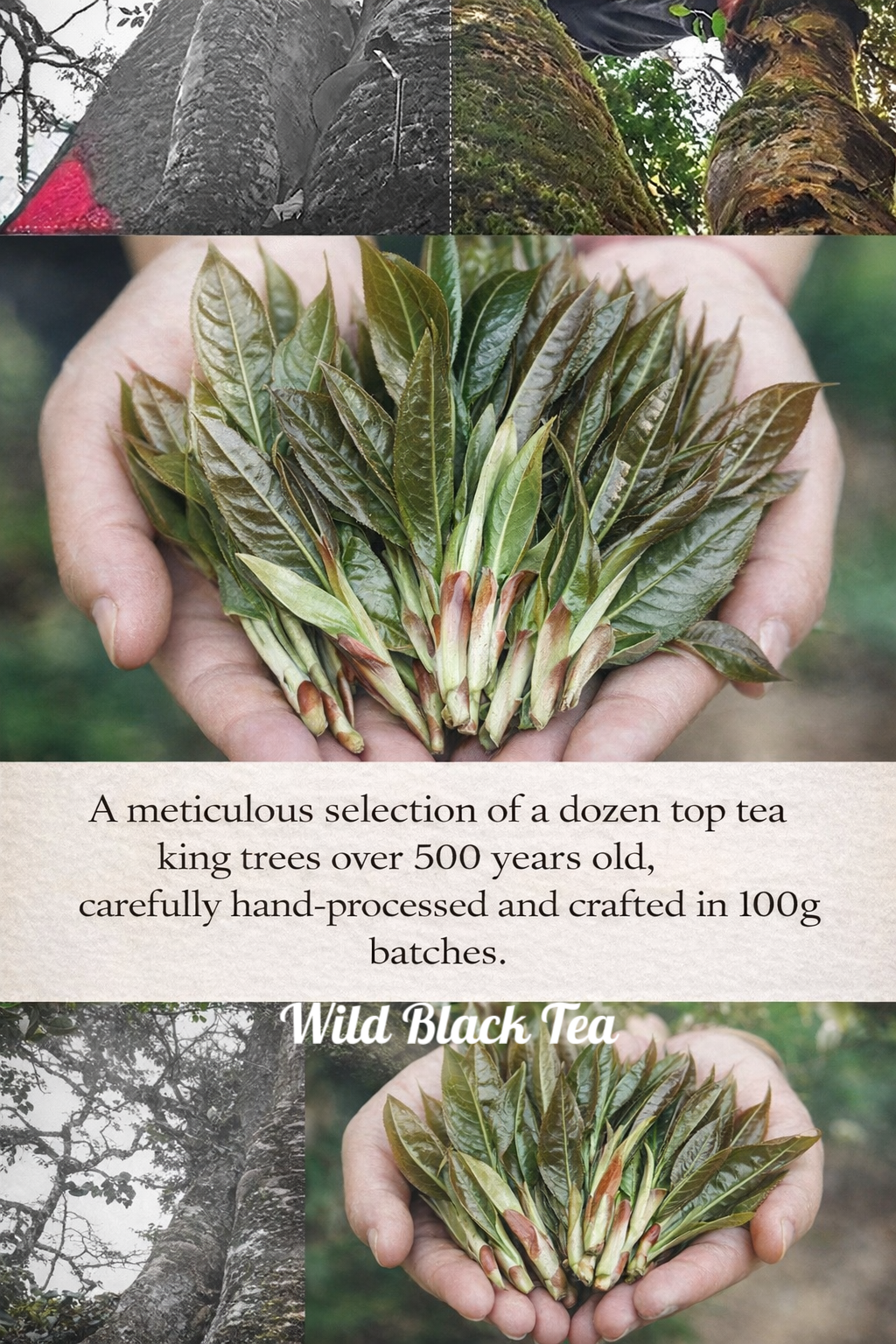 Wild Ancient Tree Black Tea A Rare Expression of the Mountain Sourced from ancient tea trees deep within the untouched forests of Yunnan, at elevations above 2,000 meters, this tea embodies a purity that cannot be cultivated—only received. Like a quiet hermit of the mountains, it grows in complete harmony with nature, untouched by human intervention. Over time, the trees draw nourishment from the mist, soil, and silence of the forest, resulting in a tea that carries both depth and vitality. Its character is unmistakably wild, yet profoundly refined. The liquor is silky and luminous, unfolding with natural sweetness and an effortless smoothness, free from harshness or bitterness. Notes of wild honey, blossoms, and ripened fruit rise gently, lingering with quiet persistence. This is not simply a tea—it is an experience of place, time, and stillness. Brewing as a Practice To reveal the full expression of this tea, brewing becomes a quiet dialogue. Teaware A white porcelain gaiwan or a Yixing clay teapot allows the tea to open gradually, offering clarity in both color and aroma. Water Temperature 90–95°C (194–203°F) Leaf-to-Water Ratio Begin with a 1:20 ratio (e.g., 5g tea to 100ml water), and adjust intuitively. Infusion Rhythm • First infusion: a brief awakening (around 10 seconds) • Subsequent infusions: extend gently, 5–10 seconds each time • The tea unfolds over 10+ infusions, each revealing a new layer of its character A Quiet Luxury To drink this tea is to step out of urgency— and into a slower, more attentive rhythm of being.